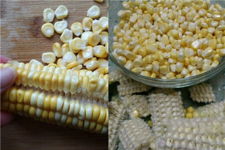 分成两半的玉米就比较容易剥,并且玉米粒也不容易破损,保持了玉米的完整度。当玉米全部都剥下来之后,就可以先用水清洗干净,然后放在碗里备用。同时,我们需要将榨汁机清洗干净,将榨汁机准备好之后,就可以将玉米粒倒入其中,这个时候不要急着加入水,因为我们可以用牛奶来代替水,并且牛奶会让玉米汁更加的香醇,口感更佳。