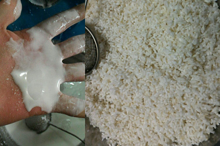 这个时候要用热水把生浆冲熟,生浆要比熟浆的分量多十倍,搅拌好后加入盐。这时候米浆基本完成,如果大家有蒸锅,可以先预热。将生的米浆倒入一个平的盘子里,要注意米浆一定要均匀地平铺在盘子上,米浆的厚度尽量控制在二点五毫米左右。米浆铺好后就可以加入馅料。