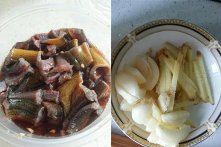 1、先将买回来的新鲜的鳝鱼剖开,去除里面的内脏。用开水洗净其表面的粘液,不然会影响鳝鱼吃起来的口感。把处理好的鳝鱼,用剪刀剪成大小适当的段状。