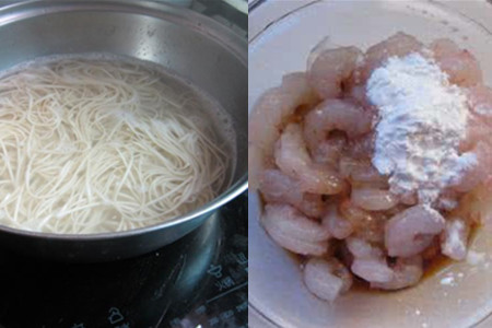1、准备的食材有鳝鱼、虾仁、葱、面条。
