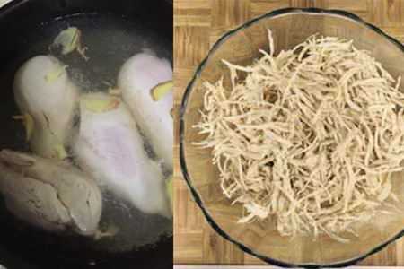 3、把煮好的鸡肉撕成细丝,放在一旁备用。