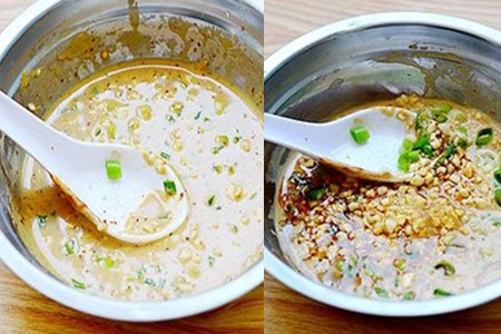 第四步,调制佐料。取一个稍大的碗,依次往碗中加入花生碎、香辣辣椒油、香醋、食盐、生抽、鸡精、料酒、葱花和大蒜。将佐料搅拌均匀,可以用筷子沾取一点尝一下味道,视自己的口感调制适合自己的味道。