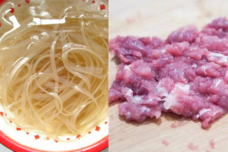 第二步,处理食材。取适量红薯粉放入冷水中浸泡40分钟,让它充分泡发变软,用手挑起来能够绵软的搭在手上,用手指甲能够轻松掐断就可以了。将泡好的红薯粉捞起来,沥干水分,放入碗中待用。将瘦肉清洗干净,先切成丝再剁成肉末,尽量切得碎一些。将生姜、大蒜、香葱和青椒分别切成碎末,分开放好。