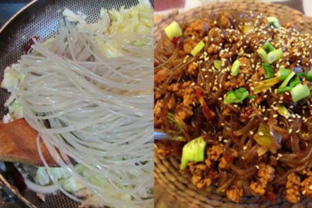 第四步,炒制蚂蚁上树。往炒好碎末的锅中加入适量的骨头汤,这里的骨头汤需要提前熬制,为的是提升整道菜的鲜度。将香醋、胡椒粉加入锅中,大火烧至沸腾。将沥干水分的粉丝倒入锅中,盖上锅盖焖5分钟,掀开锅盖,加入适量食盐和辣椒末,大火翻炒收汁,这样就炒好了。