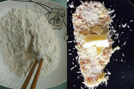 第五步:将芝士放入鸡肉的中间开口,然后将鸡肉在鸡蛋液中过几遍,让鸡蛋液沾附在鸡肉上。