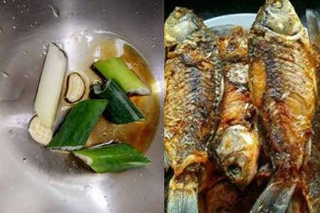 第三步,煎鱼。鱼煮成汤都会有不同程度的腥味,这里需要将鱼稍微煎一下,不仅可以去腥增香还能让鱼熟透。将锅清洗干净,擦干水分,倒入适量的油烧热,倒入切好的生姜大蒜大葱炒香,将腌制好的鲫鱼放入锅中,中小火煎一下,可以转动锅子来调整火力点,将鱼一面煎黄了再翻面,不要频繁的翻面,避免将鱼皮弄破破坏鲫鱼肉的鲜嫩感。