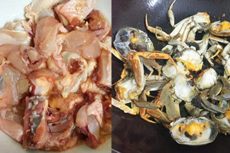 食材:大闸蟹300克、嫩鸡500克、葱、姜、蒜、紫苏叶、米酒、生粉、老抽、盐、油、浓汤宝。