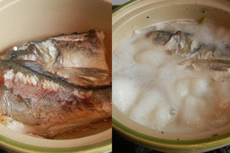 取一口砂锅,放入煎过的白鱼,加清水没过白鱼,放入葱姜和料酒,开大火煮开,转中火煮至汤汁变白。