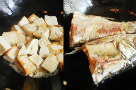 炒锅内注入适量食用油,烧热,豆腐切小方块下锅,豆腐煎成金黄色,盛出锅备用。再往锅里注入适量油,烧热,下白鱼煎制,白鱼两面煎透后盛出锅备用。