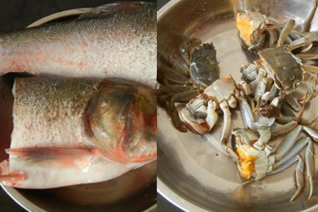 白鱼刮掉鱼鳞,去掉腮和内脏,清洗干净,对半切开。大闸蟹用刷子刷干净,一切为二,去掉腮和胃。