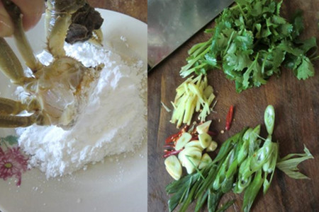 大闸蟹刷洗干净,装入盆里,倒入适量白酒,盖上盖子焖二十分钟,把大闸蟹熏醉。二十分钟后,将螃蟹一切为二,去掉腮和内脏,将切面裹上干淀粉待用。香菜洗干净切成段,大蒜去皮切成片,生姜洗干净切成丝,葱洗干净斜切成段,干辣椒洗净斜切成段。