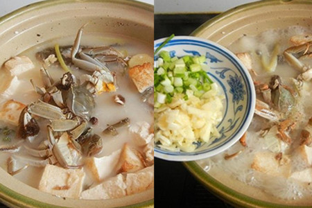 然后放入煎好的豆腐块和大闸蟹,继续煮十分钟。十分钟后,调入适量食盐、胡椒粉,放入葱花和蒜末,拌匀即可出锅。白鱼要提前下锅煎一下再放入砂锅里煮,这样鱼汤才会发白。豆腐下锅煎至金黄再放入砂锅里煮,这样不容易碎掉。【女物原创未经允许,谢绝转载!】
