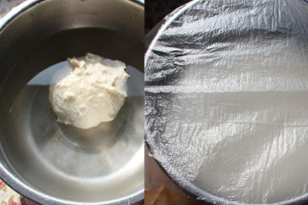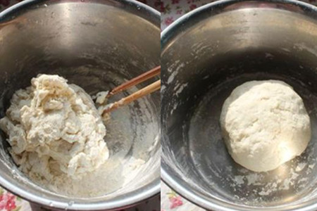 第三步,制作面皮。沉淀好的洗面水表面会变得澄清如同鸡蛋清,将盆子倾斜倒掉表面的清水留下底层的白色沉淀物。倒水的时候需要注意,不要将水倒得太干净,留下薄薄的一层就好。将盆子中剩下的水和沉淀物搅拌成均匀的面浆,放在一旁待用。