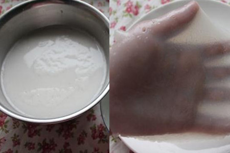 取一个铁质的盘子,在盘子内均匀的刷上食用油,再取一勺面浆放入盘子中均匀涂抹开。在锅中加水烧热,将盘子放在水面上隔水加热,慢慢的盘子中的面浆就会变成透明的面皮,这时候就将盘子取出来,倒出面皮,再往盘子中刷油加米浆继续上述步骤,将其他的面浆都制作成面皮。