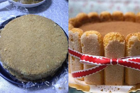 蛋糕冷藏好之后,取出蛋糕,在蛋糕顶部洒上可可粉,喜欢手指饼干的可以在蛋糕周围摆上一圈手指饼干,并用装饰带捆绑一下。