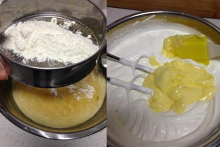 第二步,制作蛋糊。取适量的白砂糖、食盐和柠檬汁放入盆中,打两个鸡蛋,蛋清和蛋白都放入盆中。用电动打蛋器将盆中的蛋液打发起泡。将准备好的低筋面粉过一下筛,分成2-3次加入到蛋糊中。这里需要注意,一边加低筋面粉一边继续打发蛋糊,每次打发好都要用刮刀由下往上将蛋糊搅拌均匀再加入面粉。