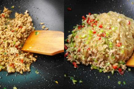5、倒入适当的清水,大火煮开后,把沥干水分的粉丝下入锅中。粉丝一定要沥干多余的水分,不然烹饪过程中非常容易粘锅。把粉丝和肉馅进行混合搅拌,大火改为小火慢慢收汁。待收汁完成后,加入些鸡精,撒上些葱花就可以食用了。【女物原创未经允许,谢绝转载!】