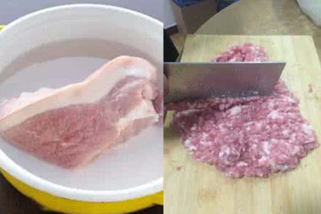2、先将买回来的猪肉洗净表面的血水,猪肉可以选择五花肉,这样肥肉相间吃起来口感比较好。把猪肉处理干净后,用刀剁成碎末状。如果嫌麻烦,也可以直接从超市购买现成的肉馅。