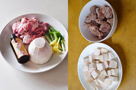 第一步:准备食材。主要食材是新鲜排骨500克,芋头250克,辅助食材是蒜头两个,生姜两片,油,盐,生粉。