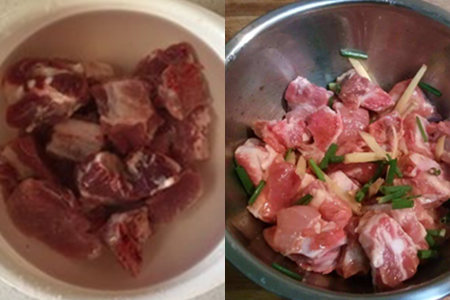 第四步:往排骨的碟里,加入一茶匙的盐,一茶匙的油,一茶匙的生粉,还有蒜蓉和姜蓉,搅拌均匀,放置一边腌制,待用。