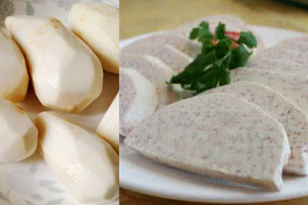 3、把蒸好的芋头剥去表皮,用刀切成片状。