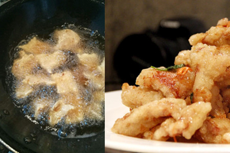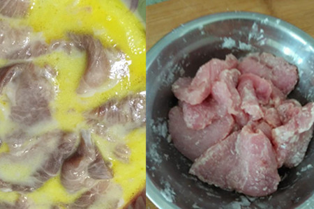 新式锅包肉跟老式的相比就在于调制汤汁的做法不一样。我们选取优质的猪里脊肉,将猪肉切成片状,注意不要切太小或太大,炸肉的时候不好做。猪肉切成五毫米宽度的薄片,然后放进一个干净的大碗内,加入适量的精盐和五香粉,轻轻搅拌均匀后倒入干淀粉,然后再打入一个鸡蛋。鸡蛋的蛋液不仅增加香味,也会让猪肉与淀粉更好的结合在一起。
