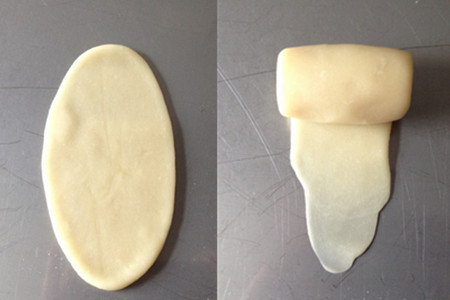 四、将水油皮擀成圆饼,以酥皮为馅包成圆球,擀成长椭圆状以后,从上往下卷起形成圆柱体。用手压扁以后再擀成长椭圆状,擀开卷起以后,两头对折捏紧。