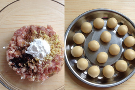 二、首先将调味料全部放进猪肉馅内搅拌均匀,腌制备用。