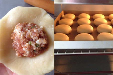 五、将开酥完毕的油酥皮擀成圆形,中间放猪肉馅收口捏紧。收口冲下放置,用手掌轻轻压扁以后一面沾上白芝麻,放入烤盘。