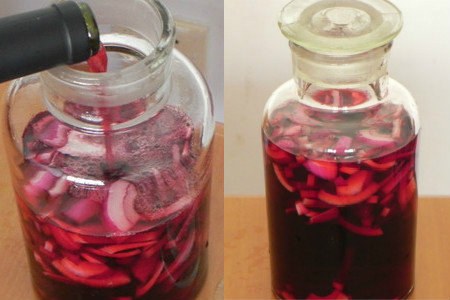 做法如下:将洋葱洗干净之后切成细丝。洋葱皮也不要舍弃,洗干净之后也要和洋葱肉混合。之后将它们放入一个密封的玻璃罐之中,在阴凉避光的地方放置2到8天。不要泡的太长时间,因为时间越长,味道也越重越怪。到时间之后,用过滤网把洋葱筛掉。单独将红酒重新放在密封罐中保存,为了延长保存期限可以将它放在冰箱之中。
