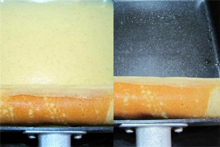 再在平底锅上涂上一层薄薄的油,用中小火加热,然后舀一勺的面糊放进锅中,这时就要快速的转动平底锅,使得面糊在锅中覆盖均匀。等到面糊的边缘部分稍微上色,中间也不再有小泡冒出时,就轻轻的将面饼铲起或揭起,翻面。翻面加热几秒就可以出锅,然后把芯心放一边,趁着热从一段开始卷起,并且收尾的地方要压在下面。