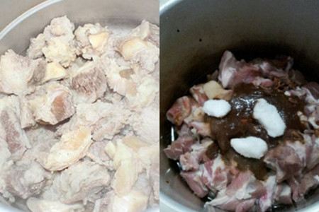 接着就是把高压锅里面放上水,记得一定要放凉水。因为放热水的情况下很快就会开锅,这样就会自动的放气。牛肉就需要好长时间才能炖熟,放的水不用太多只要把肉没过去就差不多了。再放上盐和酱油,还有姜片、蒜瓣、和葱段。