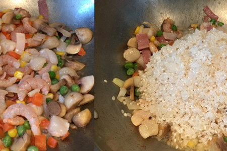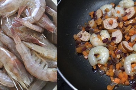 在制作之前要把虾清理一下,尤其是虾线要挑出来,要把虾头也要去掉,然后用淀粉和油腌制一下。去一些洋葱、胡萝卜和鲜蘑,洗干净,洗干净之后。切成小丁备用。锅加热后就可以放入黄油,然后把各种蔬菜丁放进去,大火翻炒。黄油浓浓的奶香味可以让这道菜更加美味。然后把准备好的虾仁儿放进去翻炒,等待炒熟后取出一部分备用,锅内加入一些高汤。