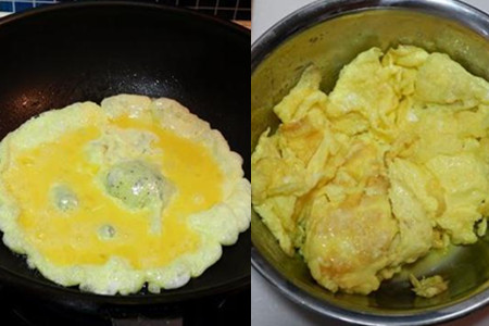这里要注意锅铲一定要擦干水分,水分遇到锅中的油会溅撒出来,溅撒出来的水油非常的烫,很容易烫伤皮肤,所以一定要注意。鸡蛋煎好以后,用锅铲将鸡蛋划开,分成小一些的鸡蛋块,翻炒一下就可以关火,将鸡蛋块盛出来备用。
