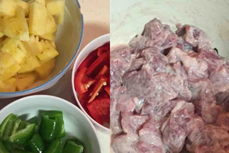 二、先把肉和菠萝都改刀成拇指指头肚大小的块状,青红椒切成大小一致的片状。