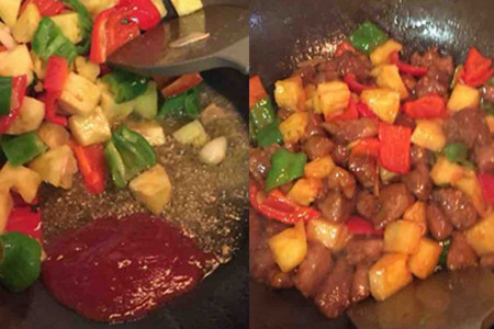 做这道菜需要注意的是,油炸里脊肉以后,翻炒青红椒和菠萝的速度要快,尽快调好味道,时间久了里脊肉失去了酥软的口感就不好吃了。
