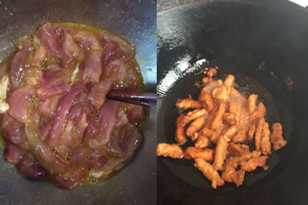 之后,我们需要在锅中倒入大量的油,然后将锅调成小火,并将肉条放入锅中炸至一分钟左右。将炸过一次的肉条放凉后,再次将肉条再次放入锅中炸一遍。接着,我们要将葱姜放入锅中,再放入一些番茄酱和酱汁,将肉条放入锅中翻炒后装盘即可。【女物原创未经允许,谢绝转载!】
