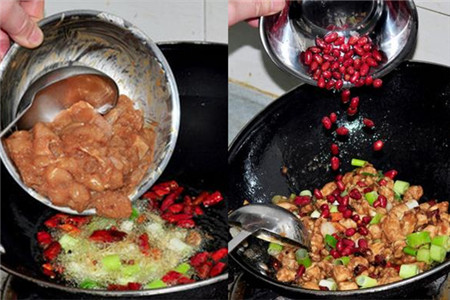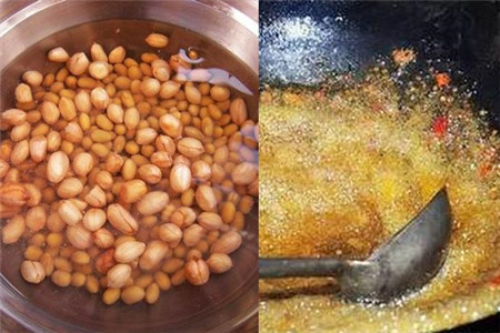放入之后就要抓均匀,并且要腌制大概15分钟。花生米事先用热水浸泡10分钟左右,然后就可以搓花生米,使其剥皮。把弄好的花生米放进已经烧热的锅中不断翻炒,炒至微微焦黄就可盛出备用。再在锅中放入适量的油,用大火把油烧至有青烟大量的上升,就放入弄好的鸡脯肉丁,继续大火翻炒,等到肉色变白时,即肉熟了,就可以盛出放进干净的盘中。