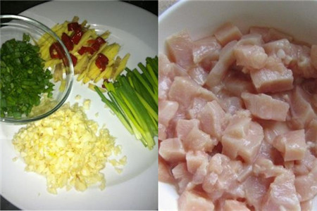先准备好材料,250克的新鲜鸡脯肉、50克的花生米、一个鸡蛋,还有适量的葱、姜、蒜、干辣椒、花椒、豆瓣酱、盐、生抽、老抽、料酒、淀粉、鸡粉、胡椒粉、白糖、醋。虽然配料有点多,但做法还是很简单的。先处理配料,把葱姜蒜切成片或小块。然后把准备好的新鲜鸡脯肉切成小块,再加入适量的胡椒粉、料酒、淀粉、还有一个鸡蛋。