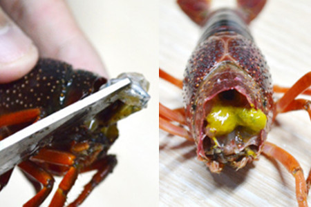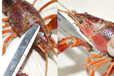 四:虾的头部也有个内脏,里面有很多脏东西,这个也要被去掉。我们要用剪刀在小龙虾头部三分之一的地方剪开一个小口子,但是千万不能直接剪断哦,剪到一半的时候就要往外拉,这时你就会看到黄色和黑色的东西,黄色的是黄膏,千万别扔了,它可是好东西哦。黑色的就是内脏了,把它扔掉就可以了。