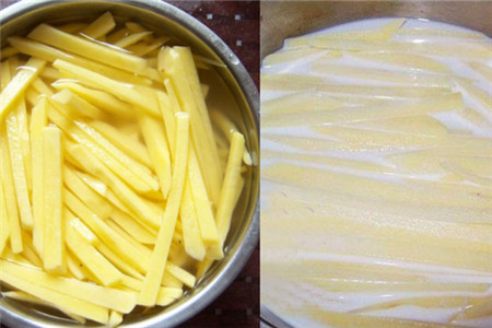 把切好的土豆先冲洗上两遍,先把粉状的东西去掉。再放入清水里把土豆里的淀粉都泡出来。锅里放上水烧开,把泡好的土豆放在锅里面煮,煮大约差不多三四分钟的时间,土豆有七八分熟。把土豆条从锅里捞出来把水沥干,这时大家可以用厨房纸把水吸干。把土豆放在碗里,倒上牛奶再进行浸泡。然后把碗放进冰箱里保险冷藏上二到三个小时。