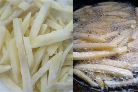 大多数的人都是非常的喜欢吃薯条,但是在外面买的嫌油反复的炸不够卫生还不安全,自己又不会做,那怎么办呢?其实,薯条做起来是非常简单的,不信你看完就学会了!要先准备两到三个土豆,然后把土豆削皮再用刀切成厚度一样打小的块状,再切成条状。切的时候要注意要切的大小均等,不然在炸的时候不好掌握时间。