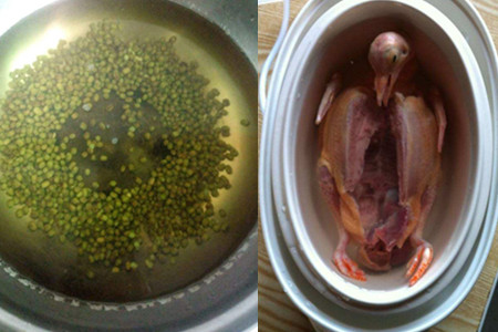 然后,将它的内脏掏除并用水不断地冲洗。接下来,我们要在锅中倒入少量的水,再将事先准备好的食材放入锅中用水焯一遍,这样可以去掉它的血水,同时也能够上去除它的异味。另外,我们也也可以在里面加入一些料酒。之后,我们需要准备一小盆绿豆,然后用清水将它洗干净,再用水将它浸泡一段时间。除了以上的这两种食材,我们还需要准备一些陈皮。