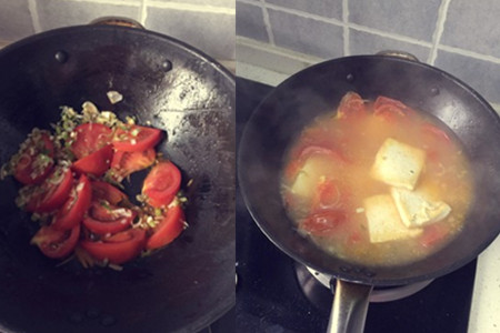 六、锅内余少量油,爆香葱蒜,放入切块的西红柿,大火翻炒到西红柿变软以后,倒入适量开水。