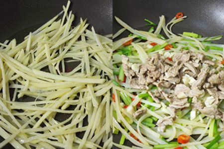 土豆丝的做法一:材料:土豆2个、瘦肉500克、香芹100克、辣椒3根、蒜蓉适量。步骤:首先把土豆削皮切丝,瘦肉切丝,香芹切段,辣椒和蒜蓉切碎备用。然后热锅倒油,先放蒜末爆香,放入瘦肉丝翻炒至变色,装盘待用。再次热锅倒油,放入土豆丝、香芹和辣椒,加盐和酱油调味。待土豆丝变软后,倒入瘦肉丝一起炒。十分钟后,便可出锅啦。
