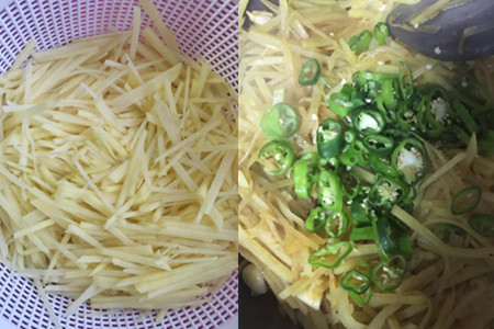土豆丝的做法二:制作材料:土豆3个、青椒2根、蒜蓉适量、生姜适量、香葱适量。制作步骤:首先把土豆削皮,再用刨丝器刨成丝,加入少量白醋浸泡,青椒切圈,生姜切丝,蒜蓉切末,香葱切碎备用。接着热锅倒油,先放蒜末和姜丝爆香,再倒入土豆丝,洒少许水。待土豆丝变得稍软时,放入青椒,加盐和酱油调味。炒5分钟左右就大功告成了。