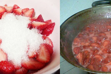 第四步,就是控制火候,边煮边搅拌直到草莓块都融化成果酱,就可以出锅了。放入玻璃瓶中,在空气中散去凉气就可封盖放入冰箱中。