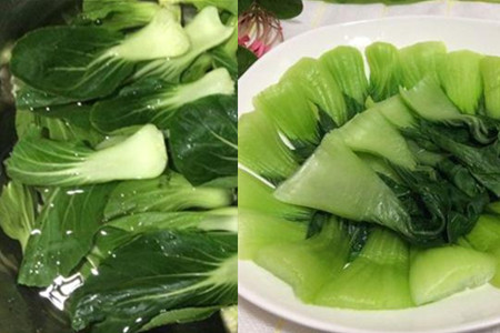 在锅中加入适量清水,烧开,将沥干水分的白菜放入开水中烫一下,大概1分钟菜叶变成深绿色就都熟了,将菜叶捞起来沥干水分,用筷子一根根摆放在盘子里,待用。