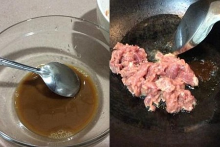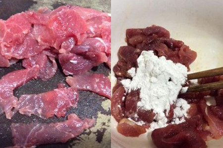第三步,处理里脊肉。将新鲜的里脊肉切成薄片装入小碗中。在碗中依次放入胡椒粉、酱油,搅拌均匀,再加入适量淀粉,搅拌一下,再用手捏一下,使淀粉均匀的包裹住里脊肉肉片。在捏里脊肉的时候可以稍稍用力,并多捏一会儿,捏过的里脊肉更加劲道,口感Q弹。