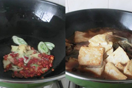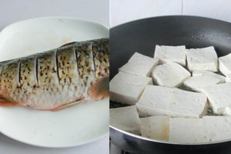 把鲤鱼的鱼鳞刮掉,抽掉腥线,在鱼身上划上几刀。平底锅上灶,注入适量食用油,烧热,下豆腐片煎制,把豆腐煎成两面金黄后盛出备用。把鲤鱼也放入平底锅内煎制,鲤鱼煎成两面焦黄,盛出备用。